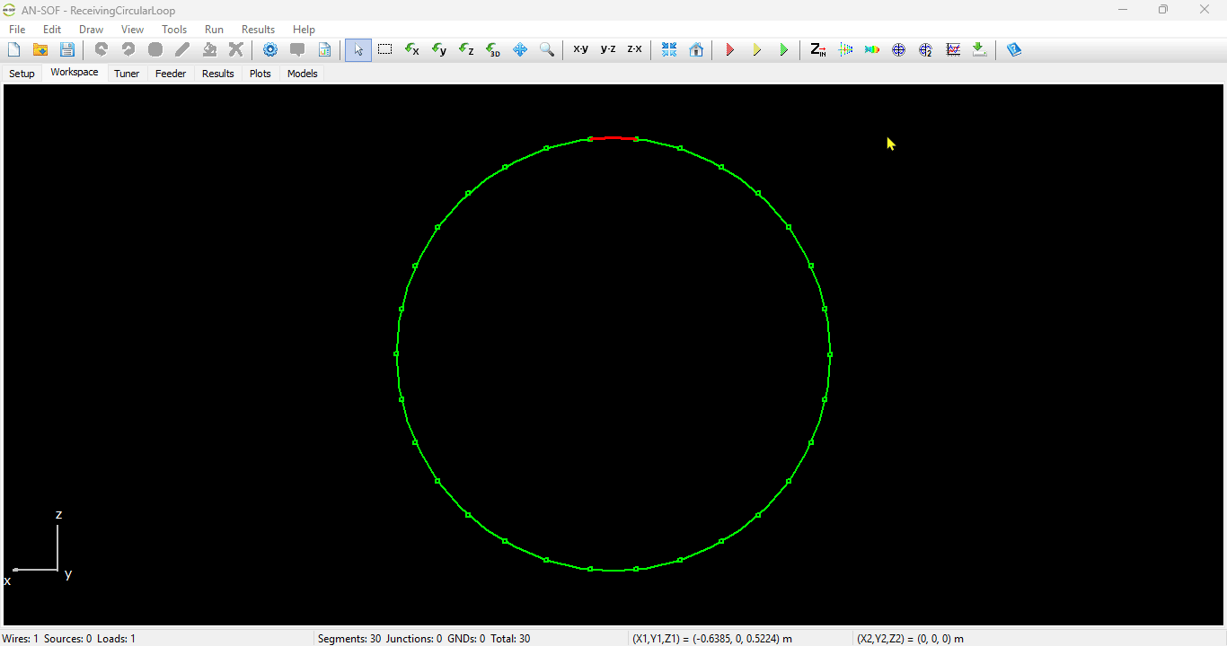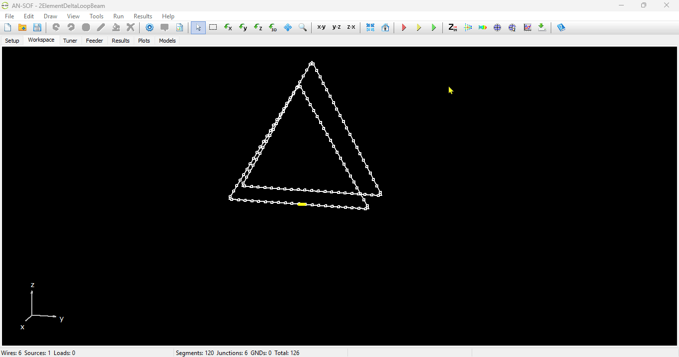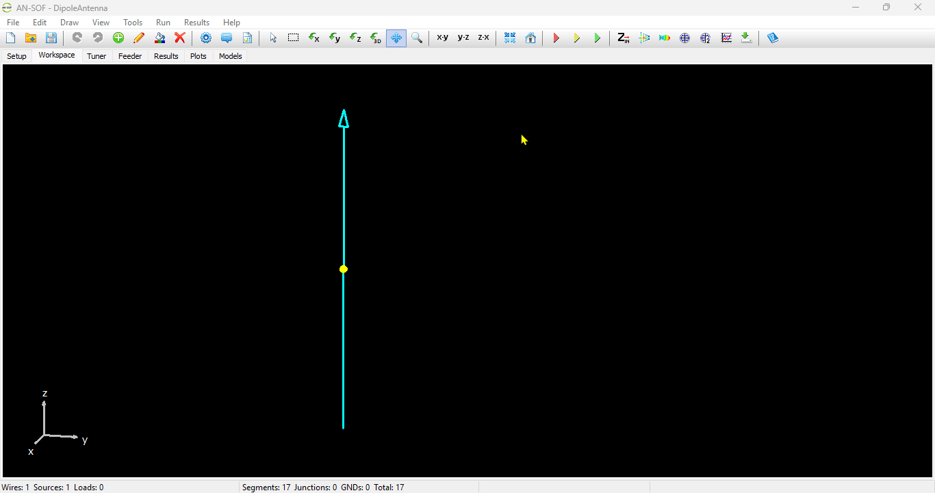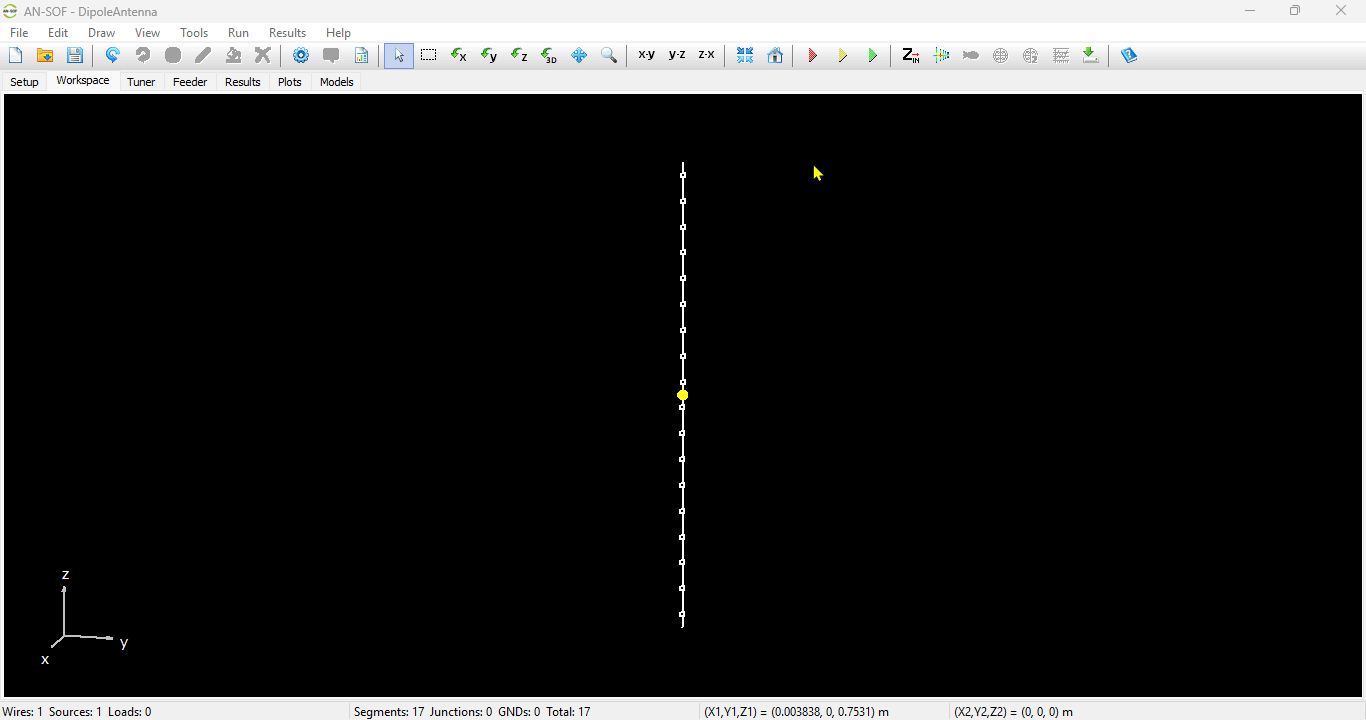 Once the operating frequency has been set, you can draw the antenna geometry on the Workspace tab. The workspace is where the wire structure is visualized, representing a 3D space that allows zooming, rotation, and movement.