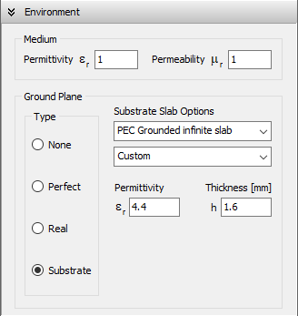 - Select a substrate material from the provided list, or choose Custom to specify the substrate’s Permittivity. Set the slab’s Thickness (h) and, if a finite slab is selected, configure its dimensions along the X and Y axes.