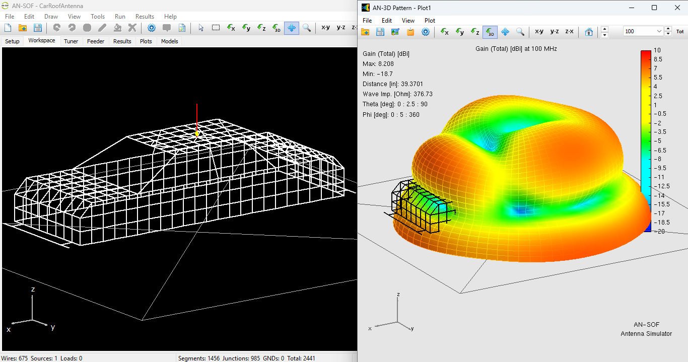 Figure 1 shows the car model with the roof monopole antenna in the AN-SOF workspace, along with the 3D gain pattern. The model can be downloaded via the button below the figure.