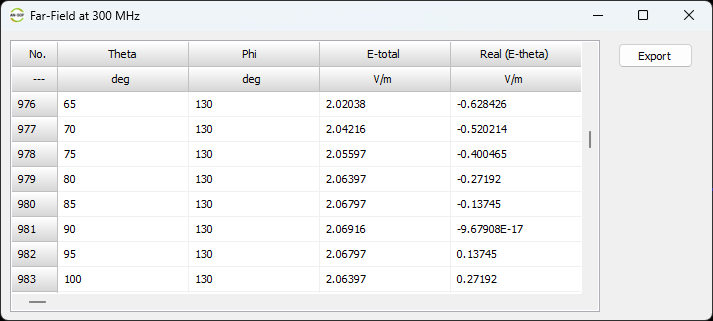 - List Far-Field Pattern: Displays the spatial distribution of the radiation (gain, directivity, or field strength) at a specific frequency for a range of angles (Theta, Phi).