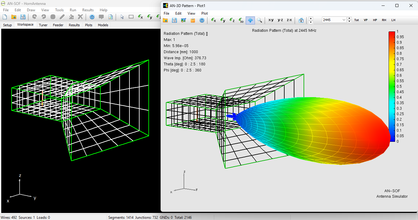 The simulation of this compact pyramidal horn demonstrates that even with an axial length of only $0.52\lambda$, high performance can be achieved through careful tuning of the waveguide feed and flare angles. By moving away from inaccurate aperture-area generalizations and utilizing numerical full-wave simulation, designers can confidently build “small-form-factor” horns that provide professional-grade gain and VSWR for WiFi and other 2.4 GHz ISM band applications.