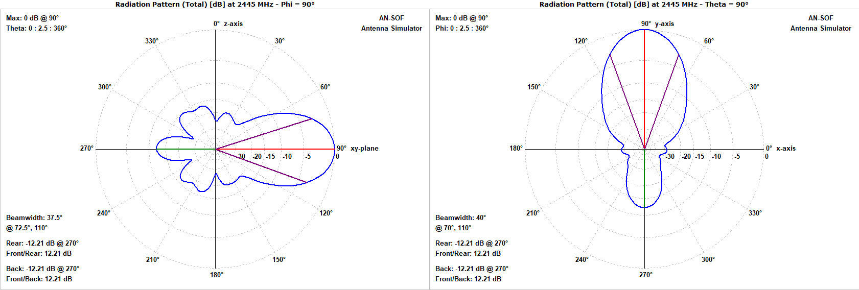 - Front-to-Back (F/B) Ratio: The F/B ratio ranges from $13$ to $10 \text{ dB}$. While lower than a large horn, it is typical for an electrically small structure where diffraction around the edges of the aperture contributes to rearward radiation.