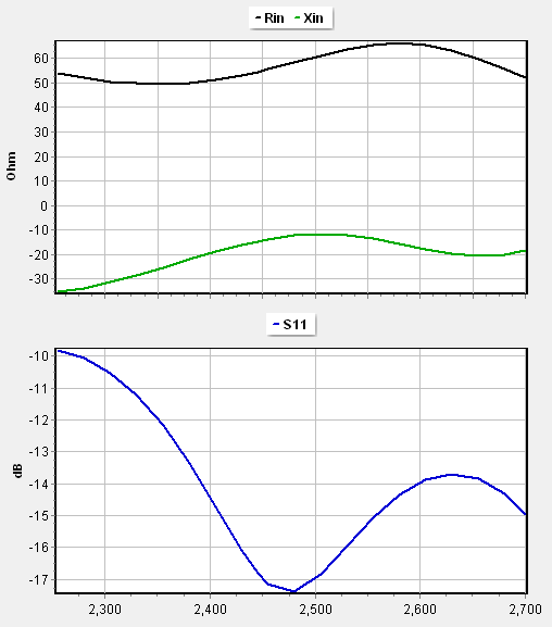 At the center frequency of $2445 \text{ MHz}$, the antenna exhibits an input impedance of $55 \,-\, j15\ \Omega$. When referenced to a standard 50-Ohm system, the VSWR is $1.3$, indicating an excellent match without the need for external tuning components.