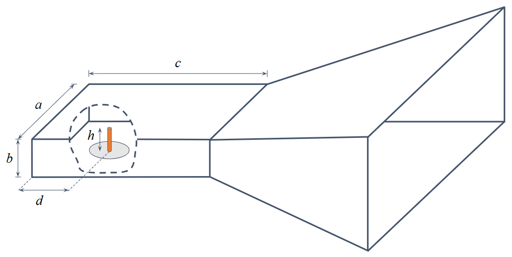 The horn is fed by a rectangular waveguide section with dimensions $a \times b \times c = 0.84\lambda \times 0.32\lambda \times 0.89\lambda$ (Fig. 2). Excitation is provided by a vertical monopole pin (feed probe) positioned inside the waveguide.