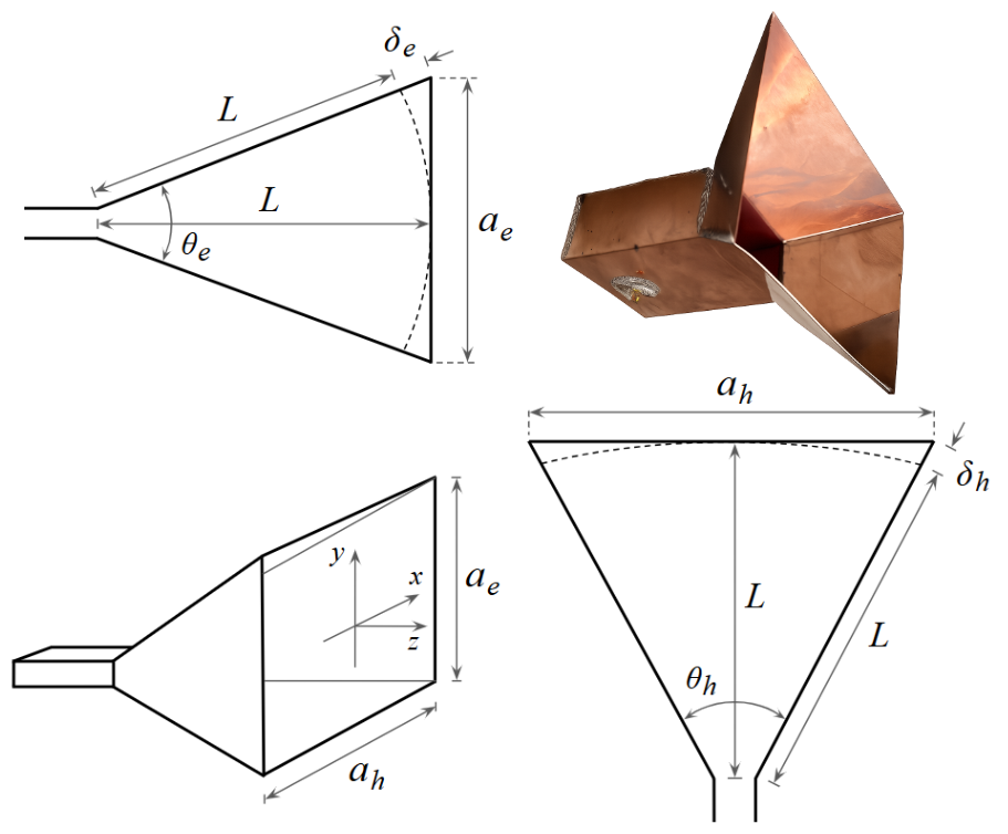 The design follows specific ratios intended to balance impedance matching with directivity. The pyramidal flare is designed with an optimal aperture ratio of approximately 3:2 and a waveguide side ratio of 2:1.