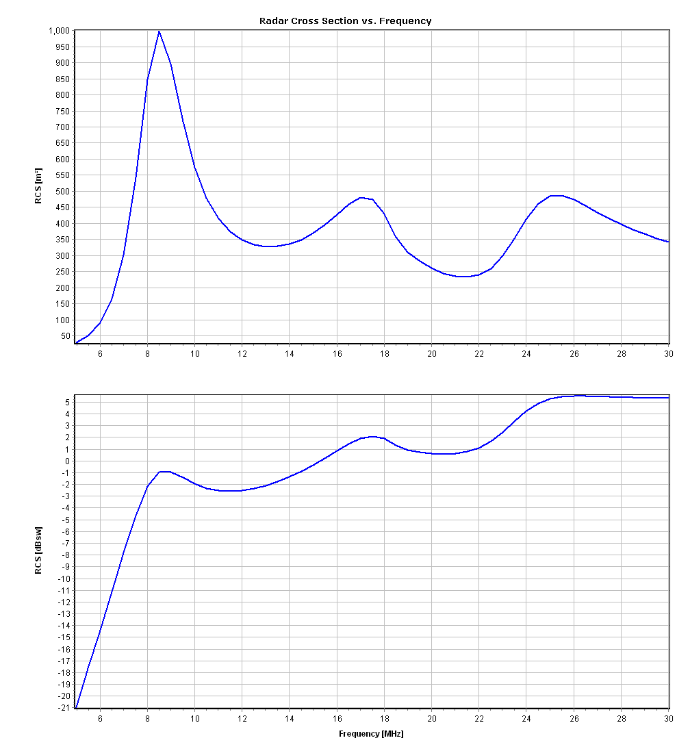 The primary peak at 9 MHz is the most significant from a detection standpoint. At this frequency, the 16.3m wingspan is approximately half a wavelength ($\lambda/2$). The E-field polarization induces a massive resonant current along the wings, effectively turning the aircraft into a resonant dipole. While the absolute area return ($m^2$) is highest at the first resonance, the RCS expressed in dBsw (decibels relative to a square wavelength) increases at higher frequencies, indicating that the aircraft becomes a more “efficient” scatterer relative to the decreasing wavelength.
